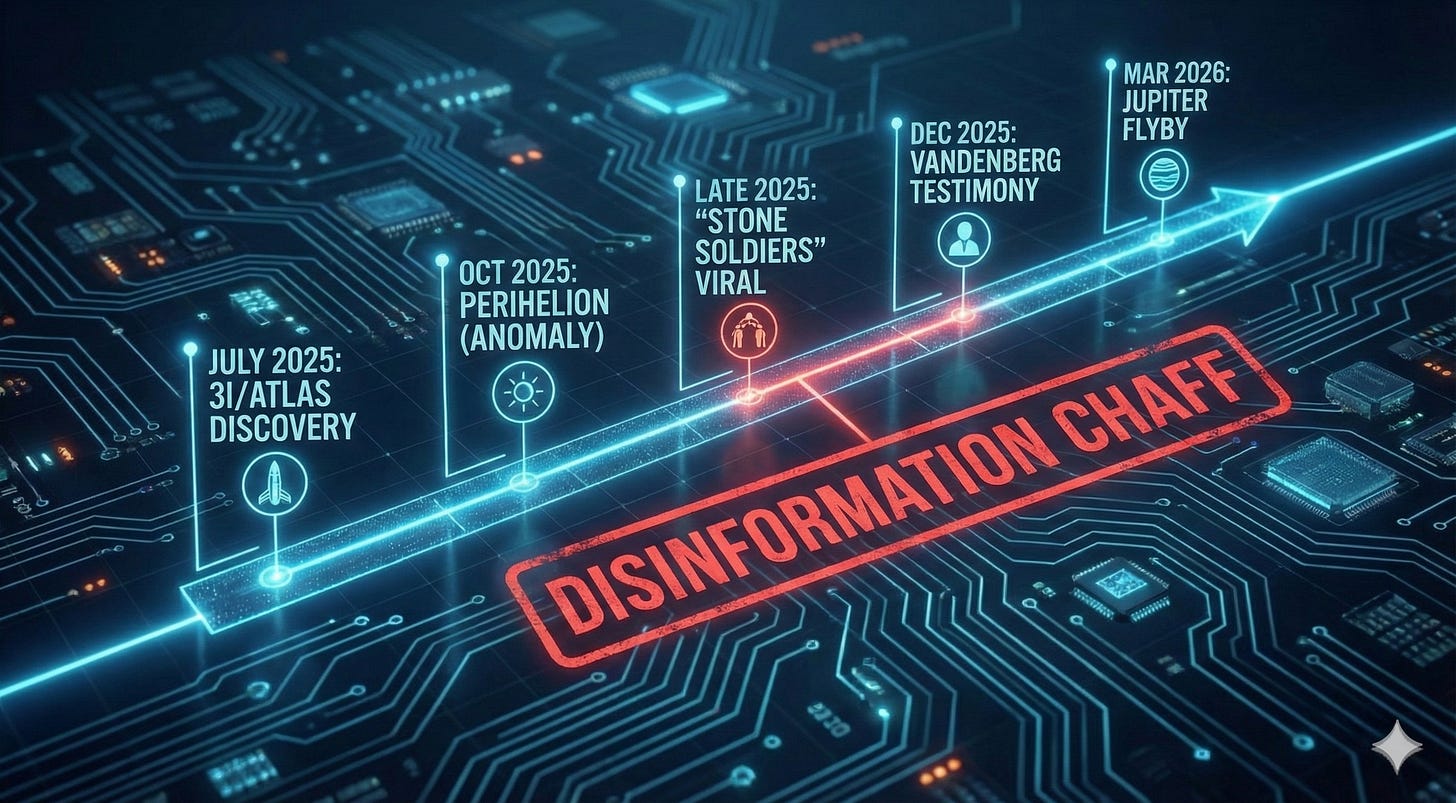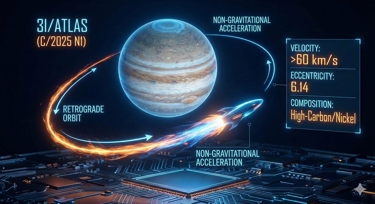 Crucially, the timing of this disinformation vector—late 2025 and early 2026—is not accidental. It coincides precisely with the critical observational window of 3I/Atlas (C/2025 N1), the third confirmed interstellar object to traverse our solar system. 3I/Atlas, currently outbound following its perihelion, exhibits genuine anomalies: a retrograde orbit, high-carbon composition, and non-gravitational acceleration that have prompted serious scientific debate regarding its artificiality.[3]