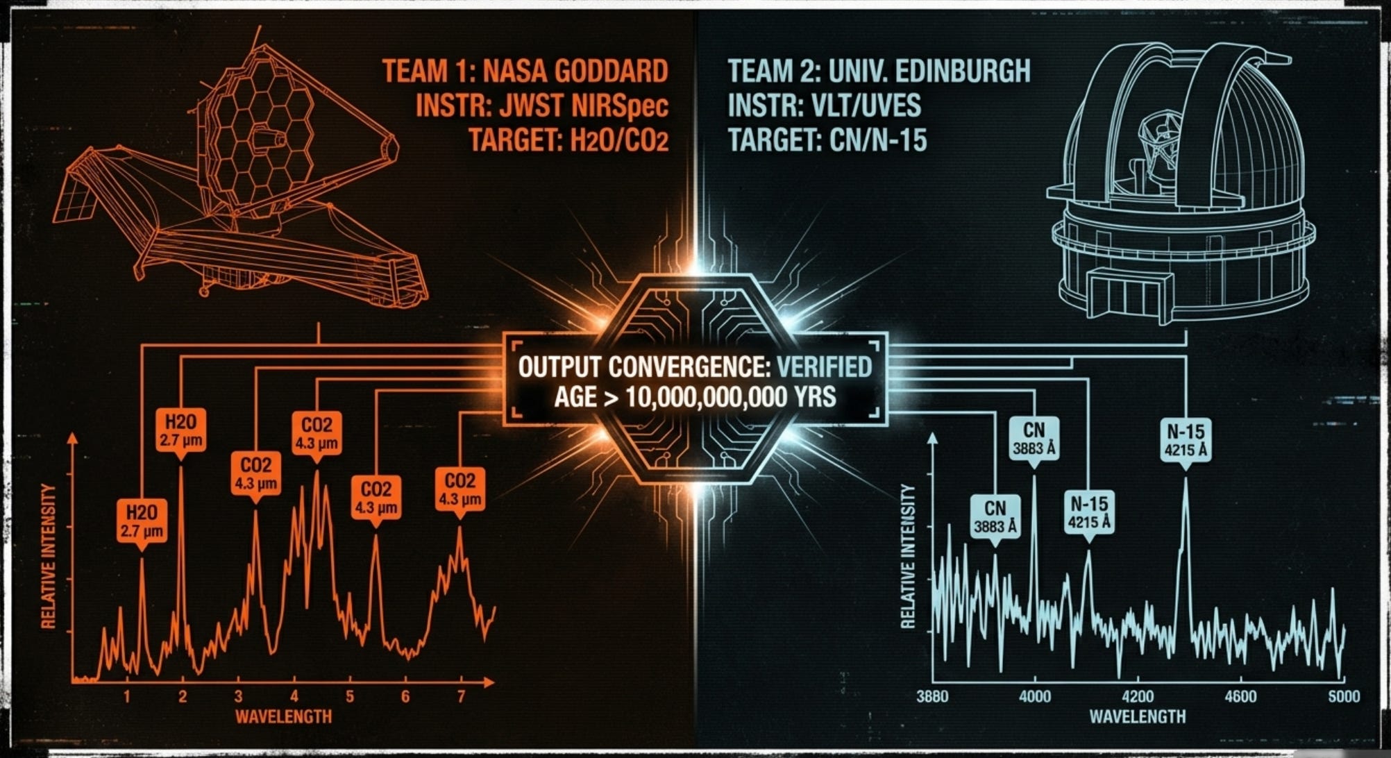 DATA CONFIDENCE: VERIFIED (JWST NIRSpec, VLT/UVES, Beijing 2.16m, Lijiang 2.4m, Hubble photometry) + HYPOTHESIS (Sentinel cross-reference analysis, mass budget calculation)