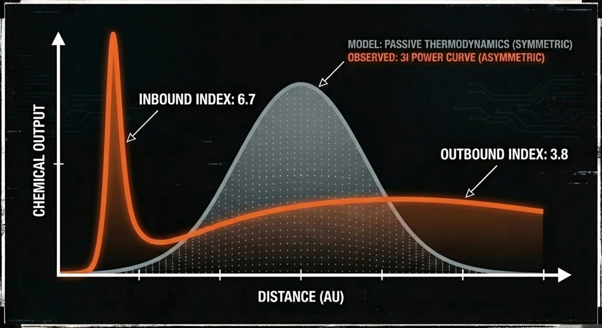 If this object were a melting snowball reacting passively to solar heating, the activation and deactivation curves should roughly mirror each other. The Sun heats the surface on the way in. The surface cools on the way out. Symmetric input, symmetric output. That is not what happened. 3I powered up fast and is powering down slow.