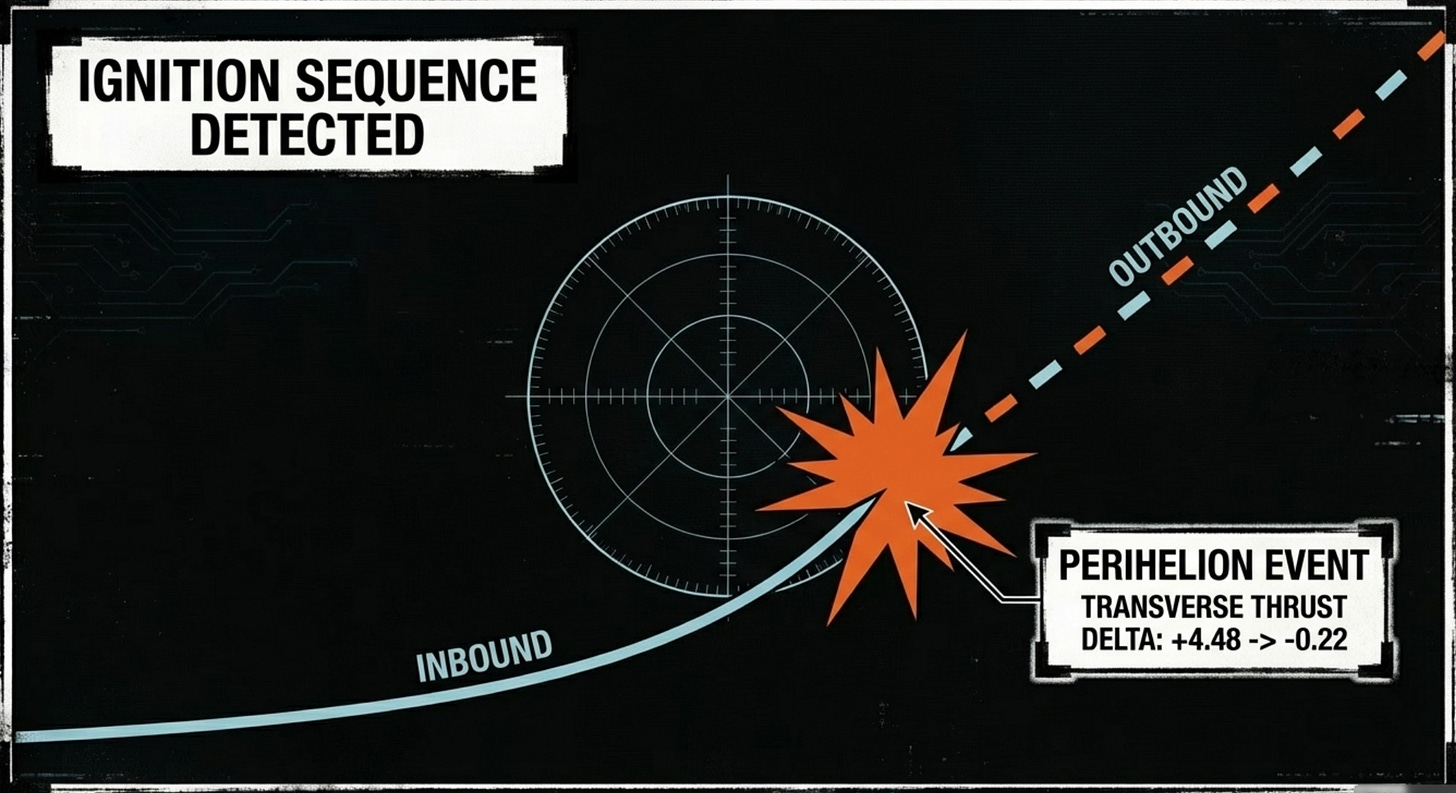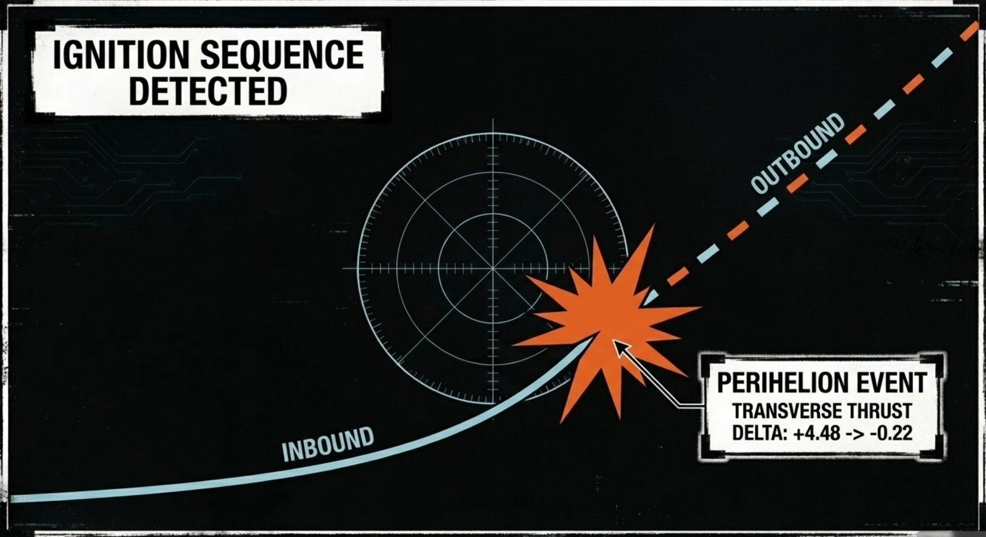 The Curated Orbit measured the force those jets produced and found the transverse thrust flipped sign at perihelion, with a braking peak seven days before closest approach.