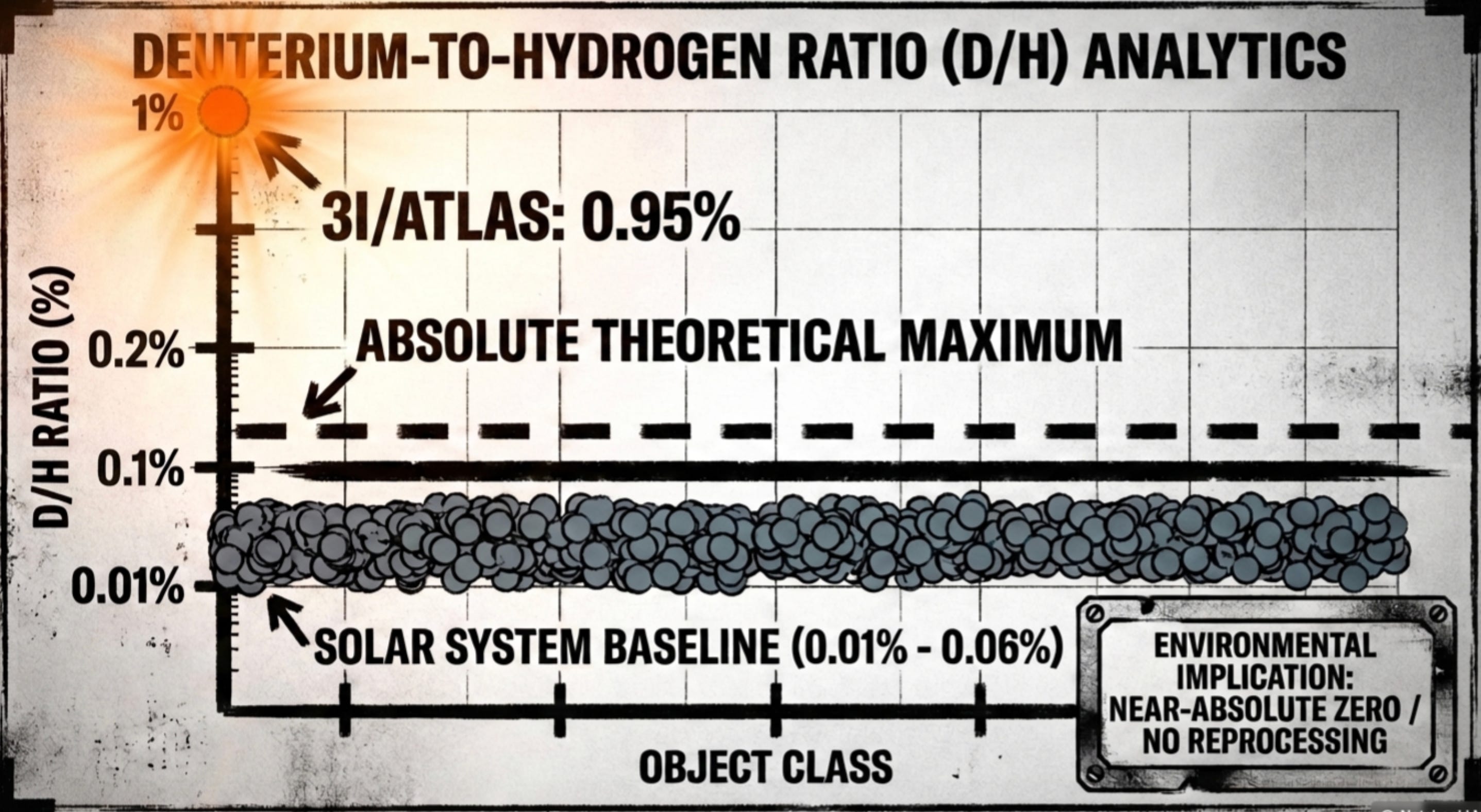 Every comet we have ever measured in our solar system carries a D/H ratio between 0.01 and 0.06 percent. Earth’s oceans sit at 0.015 percent. The most extreme outlier in our entire neighborhood tops out around 0.06 percent. That is the range. That is the shelf.