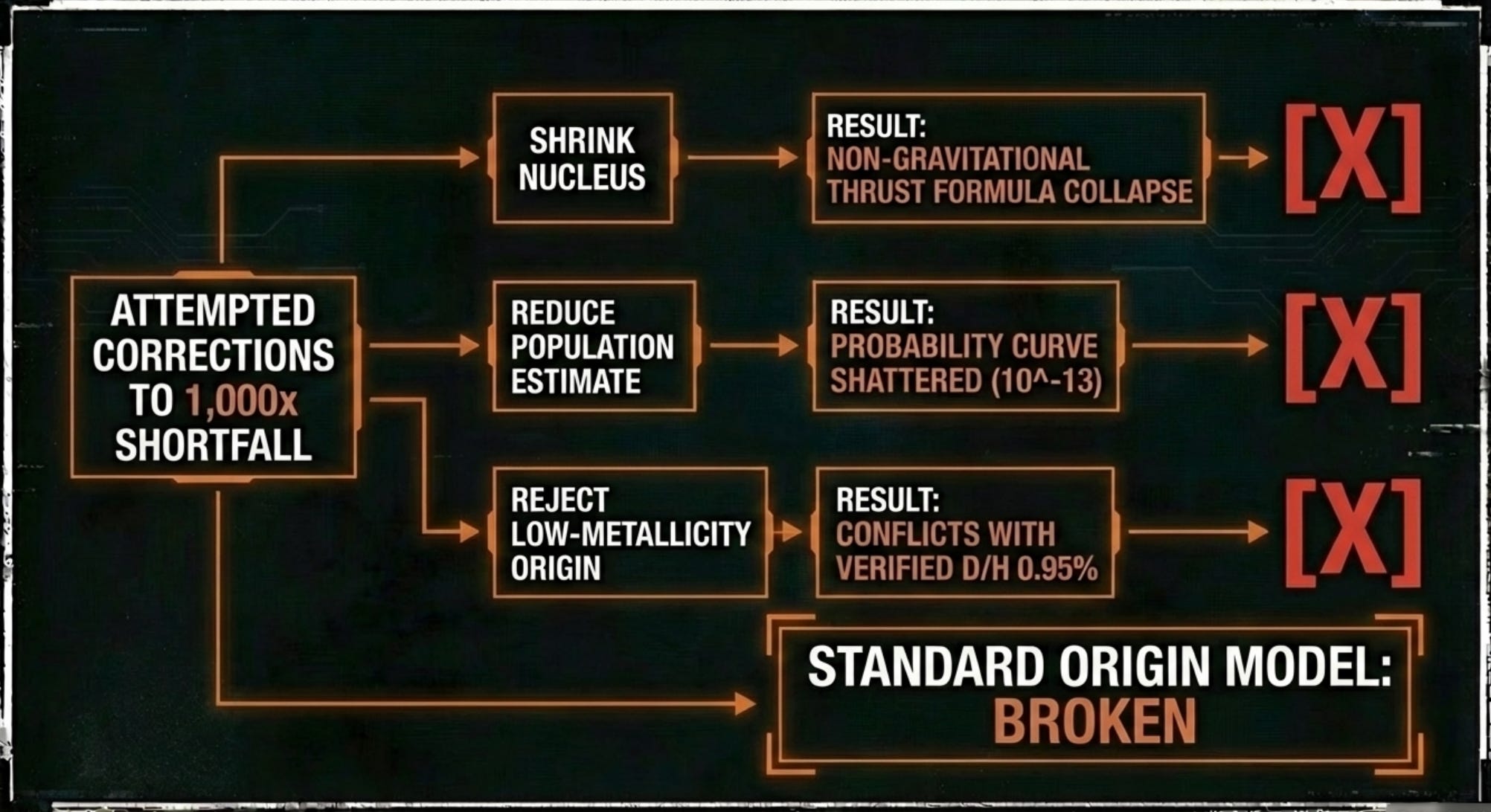Every branch hits the same wall. The standard model of interstellar object origins does not accommodate this data.