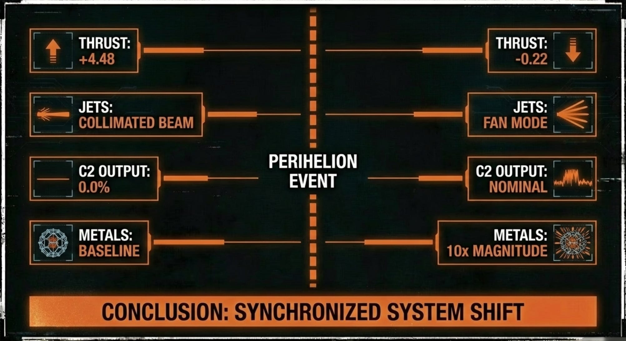 The outbound chemistry does not match the inbound chemistry. Ten times more metals. A carbon species we predicted would appear. CO potentially quintupled. An asymmetric shutdown that does not mirror the activation. The thrust reversed at perihelion. The jets reconfigured in the same window. Three independent measurement domains. Same inflection point.
