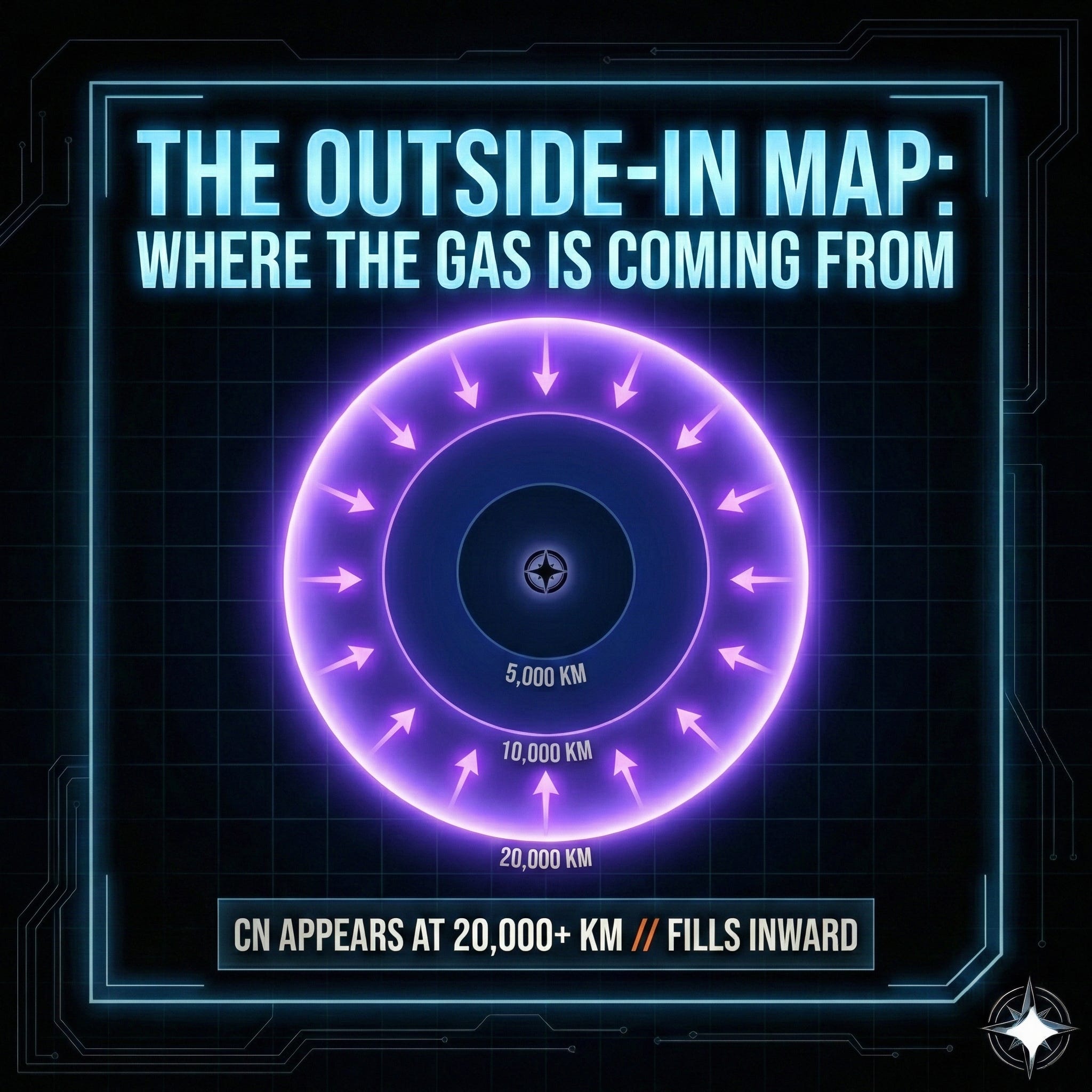At a specific distance from the Sun, one chemical emission system switches on. The gas doesn’t come from the surface — it appears 20,000 km away and fills inward.
