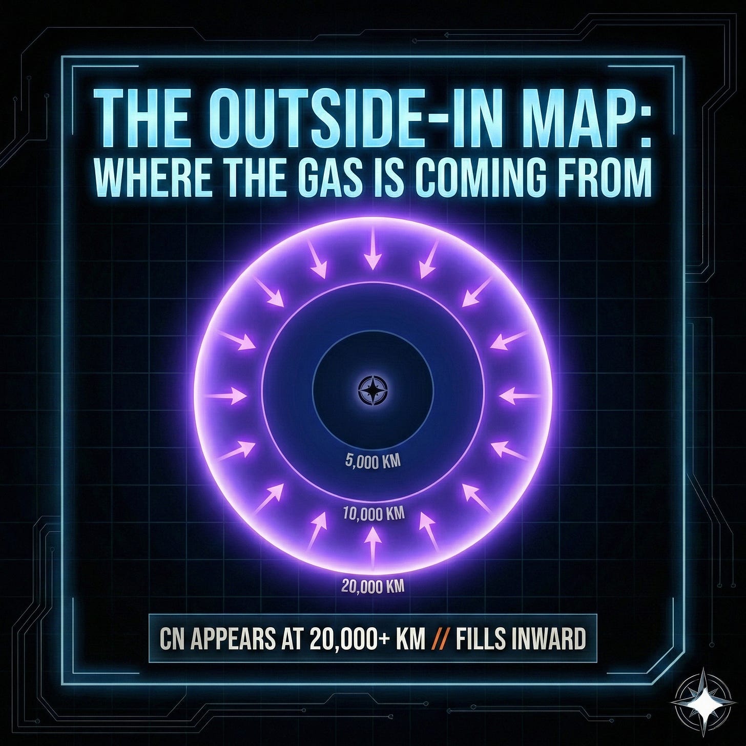 The CN gas appears first in the far outer cloud, more than 20,000 km from the nucleus, and progressively fills inward — the opposite direction from surface outgassing. No other gas species detected in any filter. Just CN.