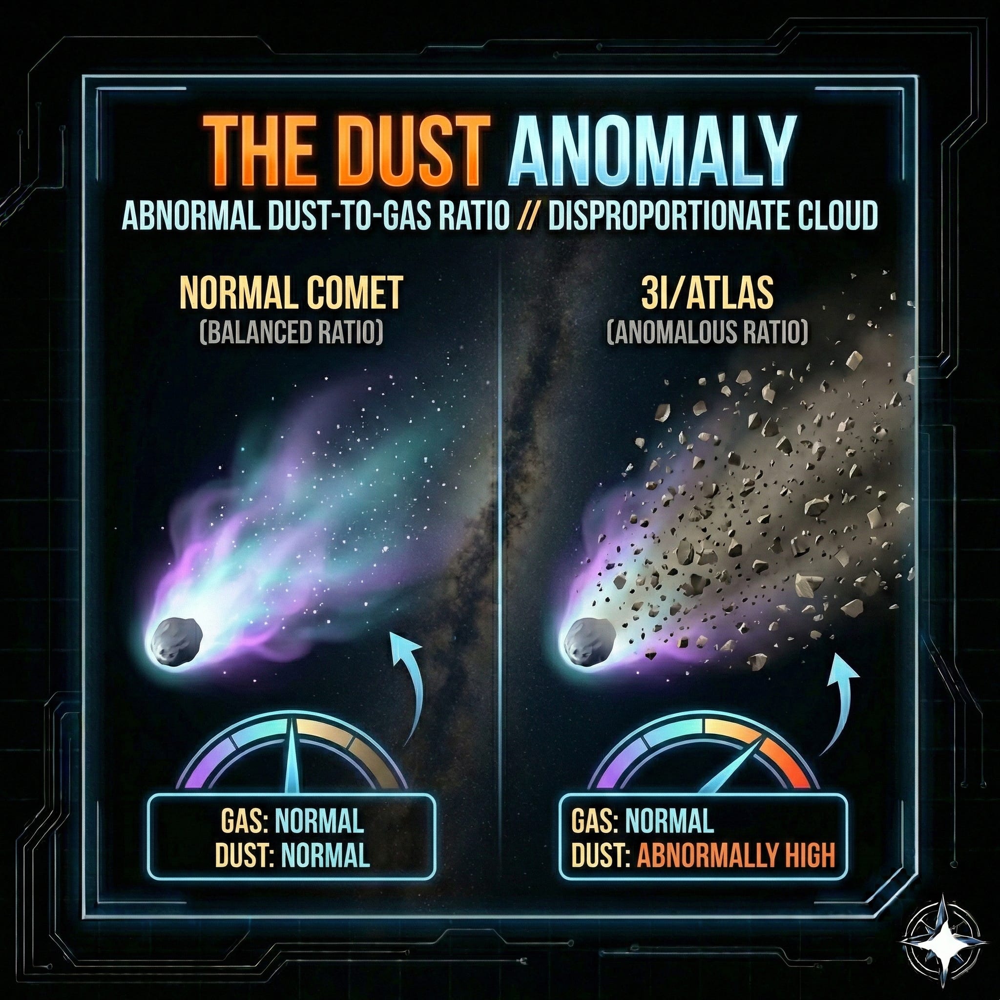 Dust levels: Way too high. Elevated by several times compared to most comets. The paper describes 3I’s cloud as “among the more dust-rich.”