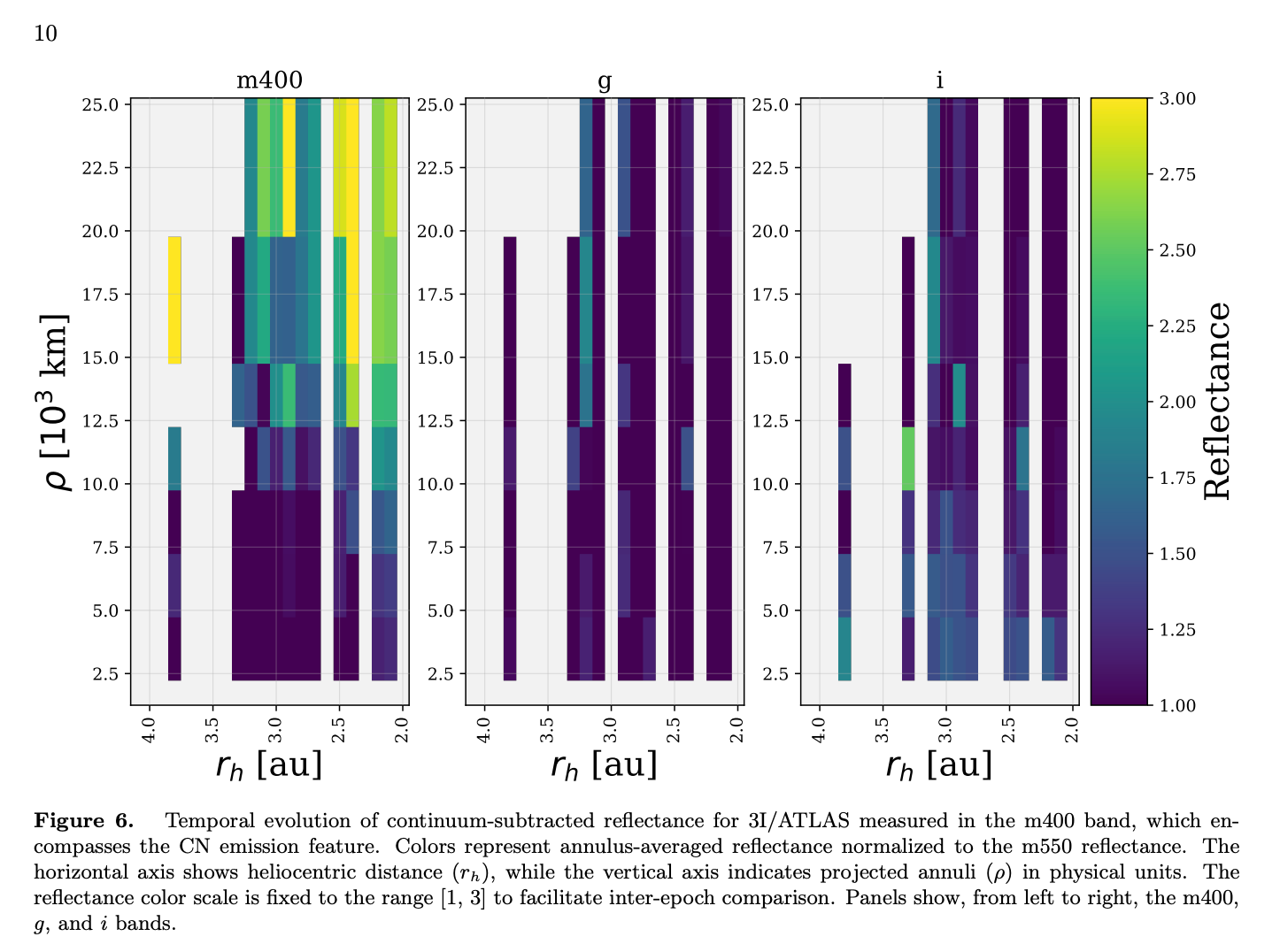 Because the 7DT takes actual images, the team was able to map where the CN gas was appearing at each observation. They measured brightness in rings at set distances from the nucleus, from 1,500 km (close-in) out to 25,000 km (deep into the surrounding cloud).