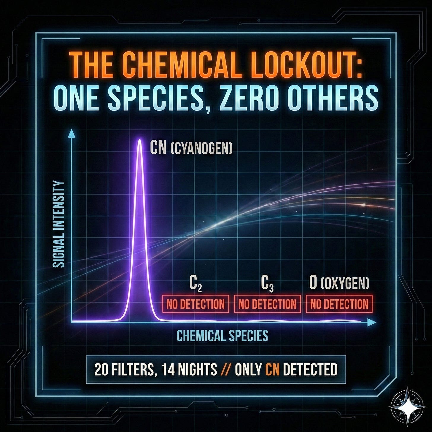 The result: Only CN. No C₂. No C₃. No oxygen emissions. Fourteen nights. Twenty filters. Two months of watching. The only gas they ever detected was cyanogen.
