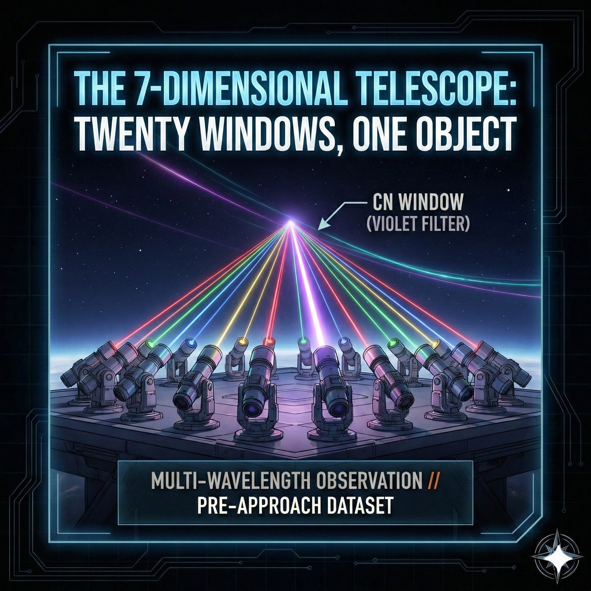 The 7-Dimensional Telescope is not one telescope. It’s twenty. 20 separate telescope units in Chile, each with a different color filter, all pointed at the same target at the same time. As gas burns off, it emits a specific color signature. If the object is emitting any specific chemical signature, at least one of those windows will catch it.