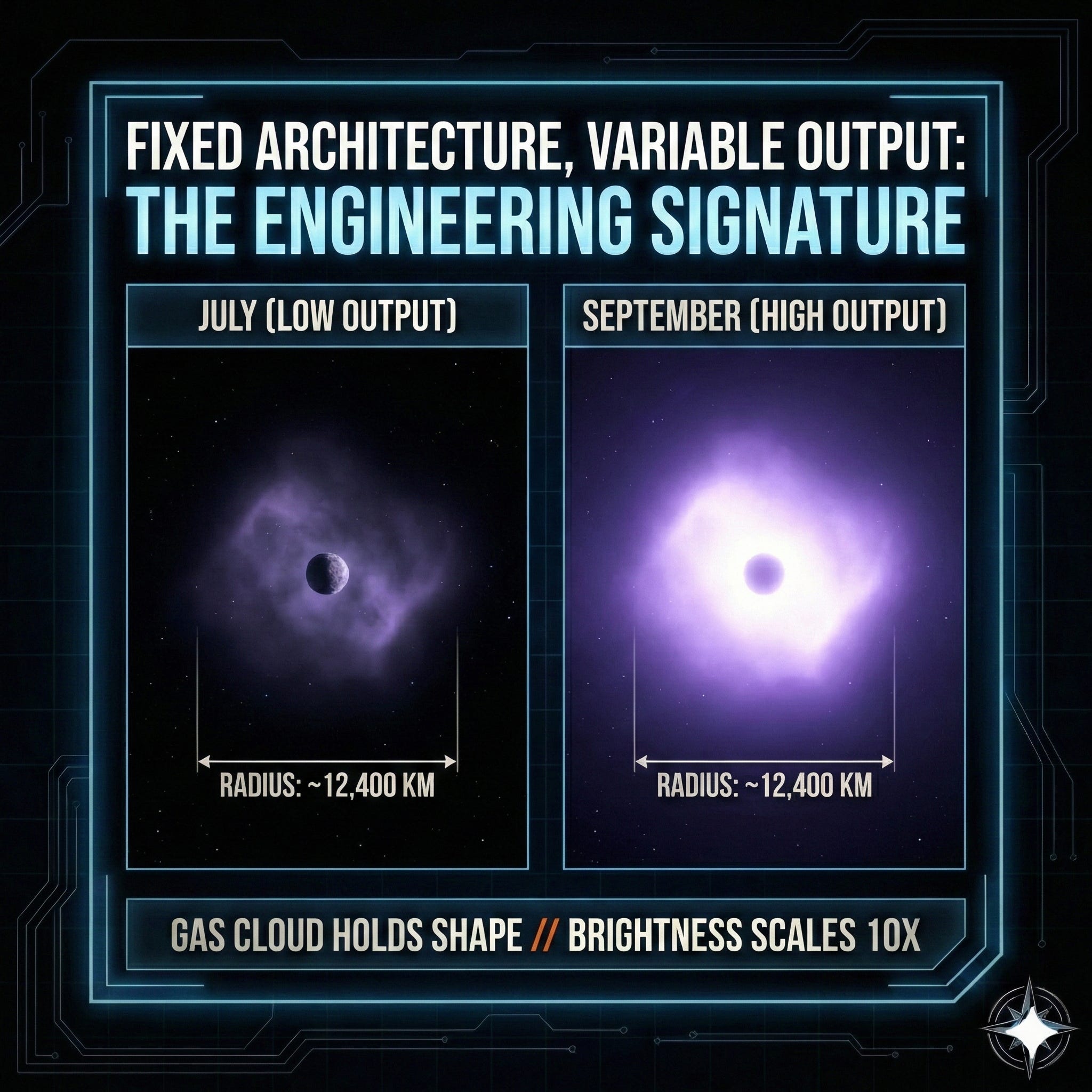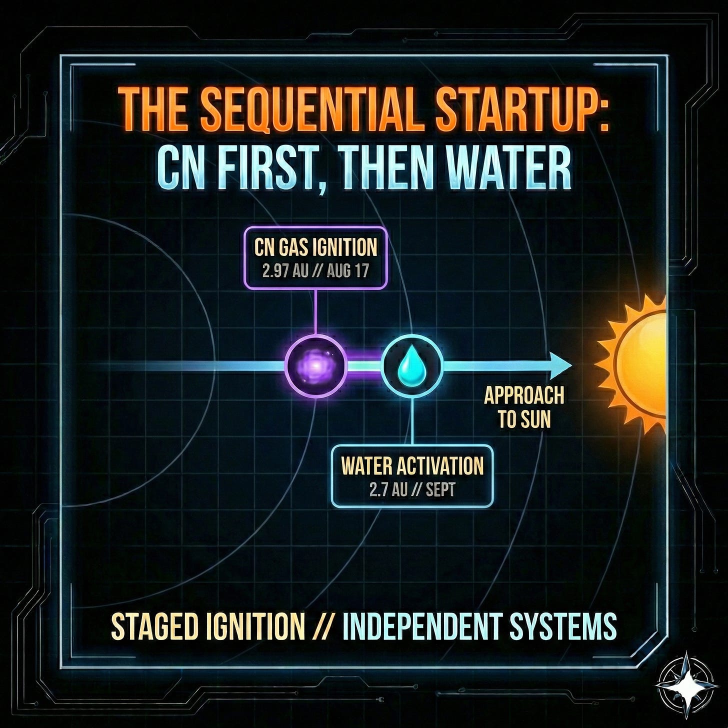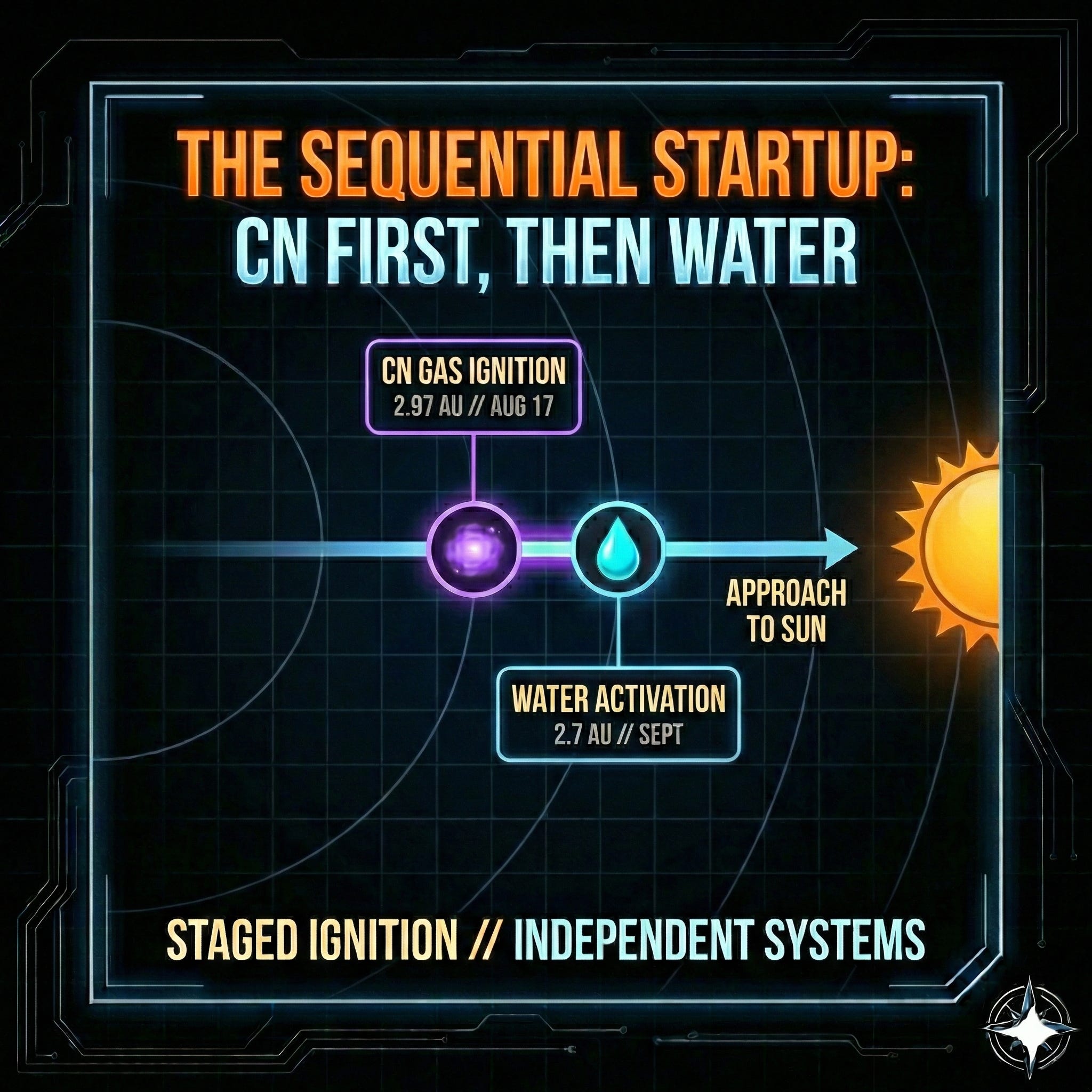 First the CN gas activates at 2.97 AU. Then the water system scales at 2.7 AU. Then the X-ray halo appears. Then the jets tighten into beams. Then the hull disappears behind the exhaust. Then the system abruptly changes mode on December 27.