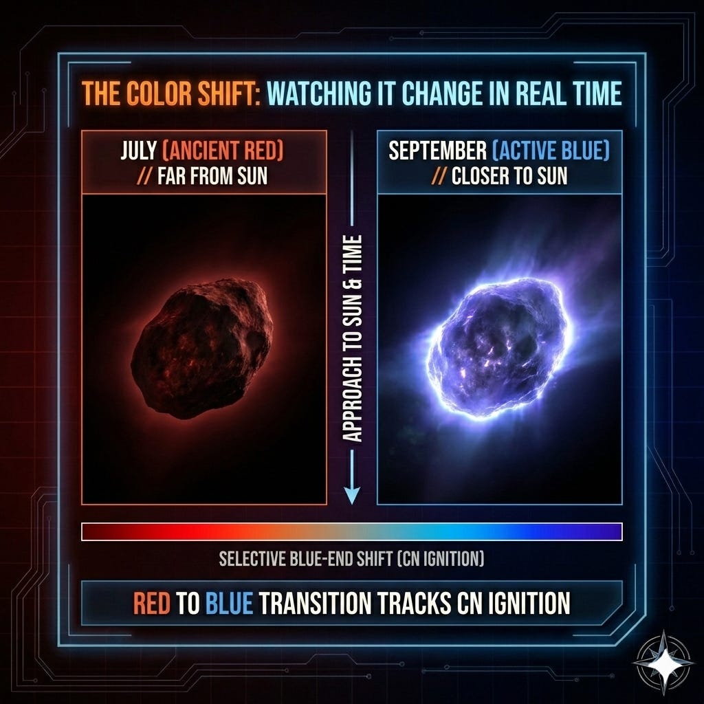 But if you’re genuinely uncovering a fresh icy surface, the color should shift across the entire visible range, not just at the blue end. A selective blue-end shift is more consistent with a new emission source lighting up specifically at short wavelengths. Which is exactly what CN gas does — it glows violet-blue.