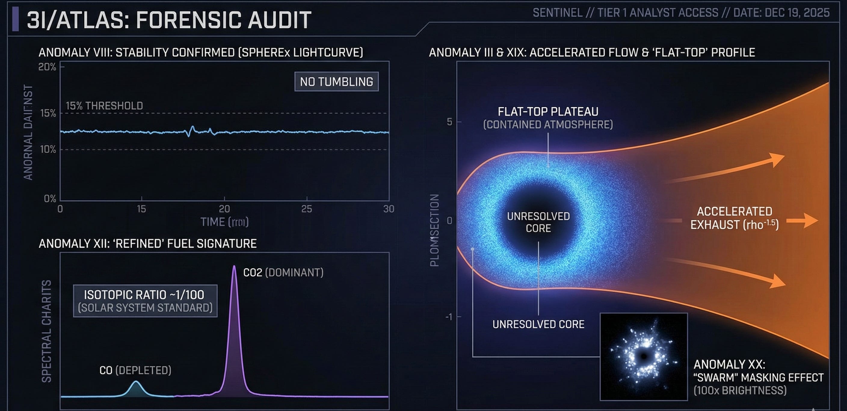 The Anomaly: Instead of tumbling, the object is stable. A “flat” lightcurve over a two-week period, despite the massive exhaust output, indicates Gyroscopic Stabilization. The object is maintaining a fixed orientation relative to the observer or the Sun, a behavior consistent with a controlled craft rather than a drifting rock.